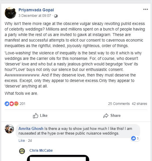 This topic though, would not leave me alone, and a simple search, showed that the original post was made by a girl called Priyamvada Gopal on Facebook and even reposted by another person.