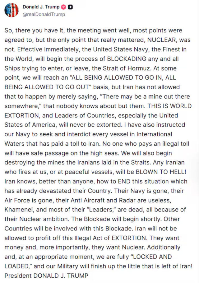 In a Truth Social post, he wrote, “So, there you have it, the meeting went well, most points were agreed to, but the only point that really mattered, NUCLEAR, was not. Effective immediately, the United States Navy, the Finest in the World, will begin the process of BLOCKADING any and all Ships trying to enter, or leave, the Strait of Hormuz.”