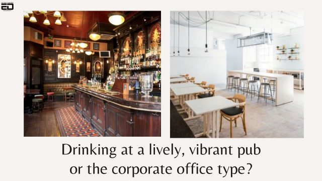 6. The bar in the left photo is indicative of buzzing with life, whereas the minimalist bar in the right photo exudes a very formal tone, almost like a corporate meeting room.