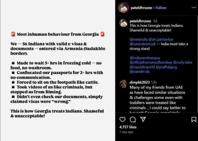 In the Instagram post, Patel wrote, “Most inhuman behaviour from Georgia. We were 56 Indians with valid e-visas and documents who entered via Armenia (Salakhlo border). We were made to wait for five hours in the freezing cold – no food, no washroom.