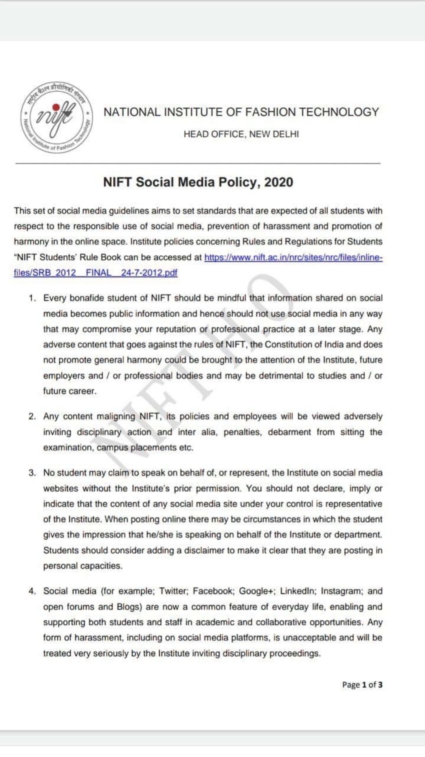 NIFT’s Alleged Social Media Rules Stating Action Against ‘Any Maligning Content’ Are Counter Productive & Sad