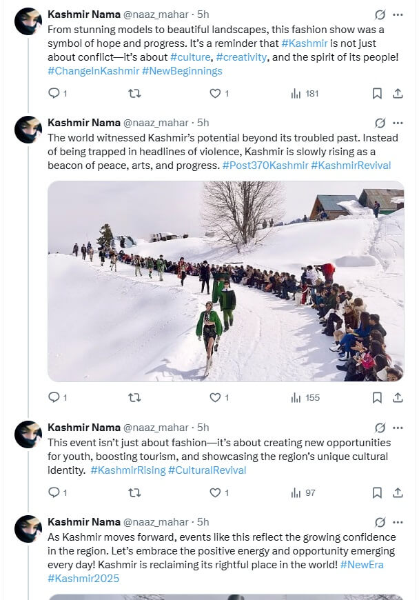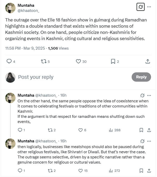 Kashmir’s chief cleric Mirwaiz Umar Farooq also critiqued it, writing in an X/Twitter post “Outrageous. That in the holy month of Ramzan an obscene fashion show is organised in Gulmarg, pictures & videos from which have gone viral sparking shock and anger among people. How could it be tolerated in the valley known for its sufi, saint culture and the deeply religious outlook of its people? Those involved should be immediately held accountable. Such obscenity in the name of tourism promotion will not be tolerated in #Kashmir!”