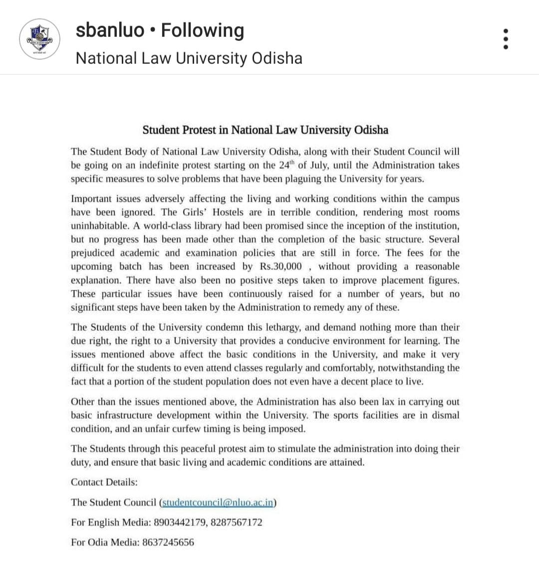 Student Body Association Of NLU Odisha Takes The Indian Law Colleges By Storm With Their Indefinite Strike Against The Admin On Various Issues